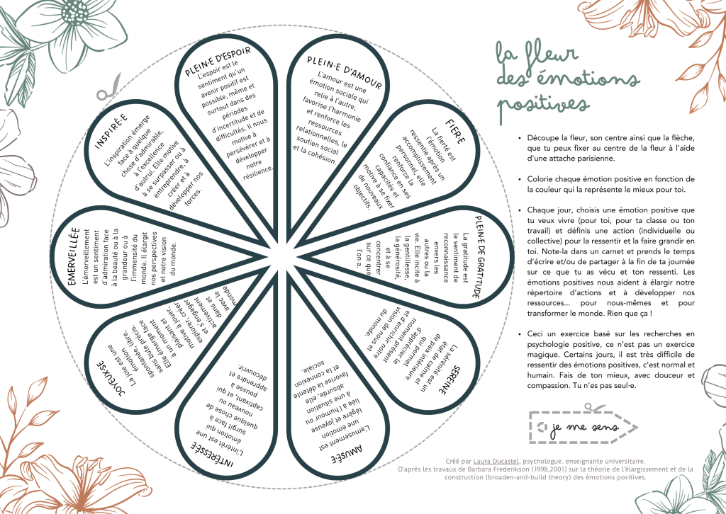📖 La fleur des émotions positives : un outil que j’ai créé au service du développement de nos émotions agréables pour enrichir nos répertoires d’idées et d’actions qui soutiennent notre autonomie, notre bien-être et le vivre-ensemble. Téléchargement libre et gratuit ci-dessous :