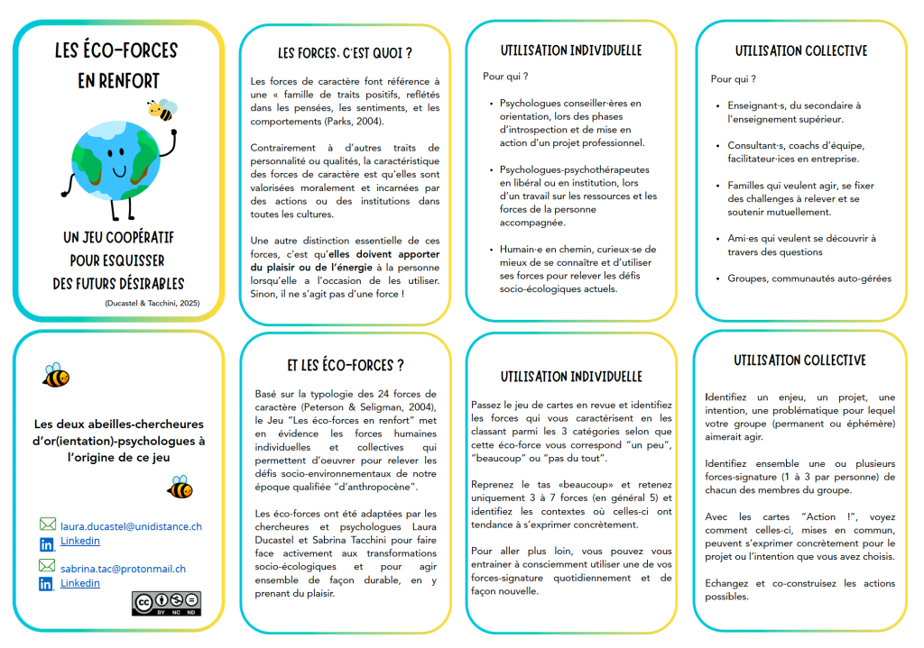 🃏 Les éco-forces en renfort ! : les forces de caractère au service des transitions socio-écologiques. Un jeu de cartes pédagogique co-créé avec Sabrina Tacchini, chercheure en psychologie du conseil en orientation à l’Université de Lausanne et cofondatrice de Slow ta carrière, pour une orientation qui respecte les limites planétaires.